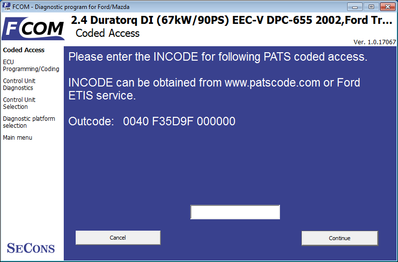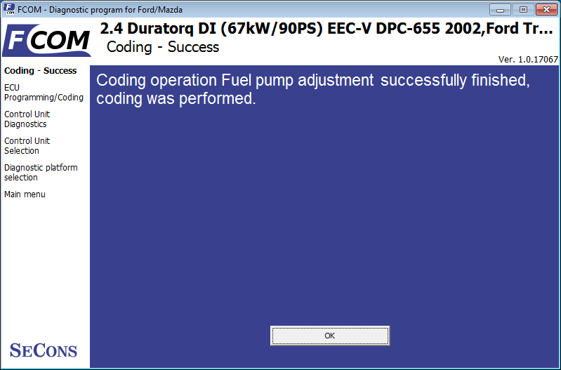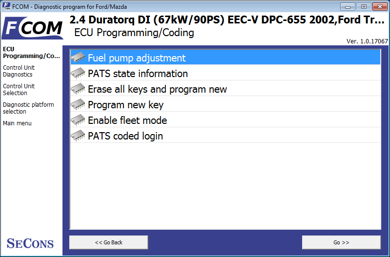 Podłącz do jednostki sterującej silnika (PCM) przez FCOM. Funkcję Regulację pompy paliwa można znaleźć w menu Programowanie/kodowanie ECU. Wybór innych funkcji kodowania, takich jak logowanie PATS, usuwanie kluczy itp., nie jest konieczny do regulacji pompy paliwa.